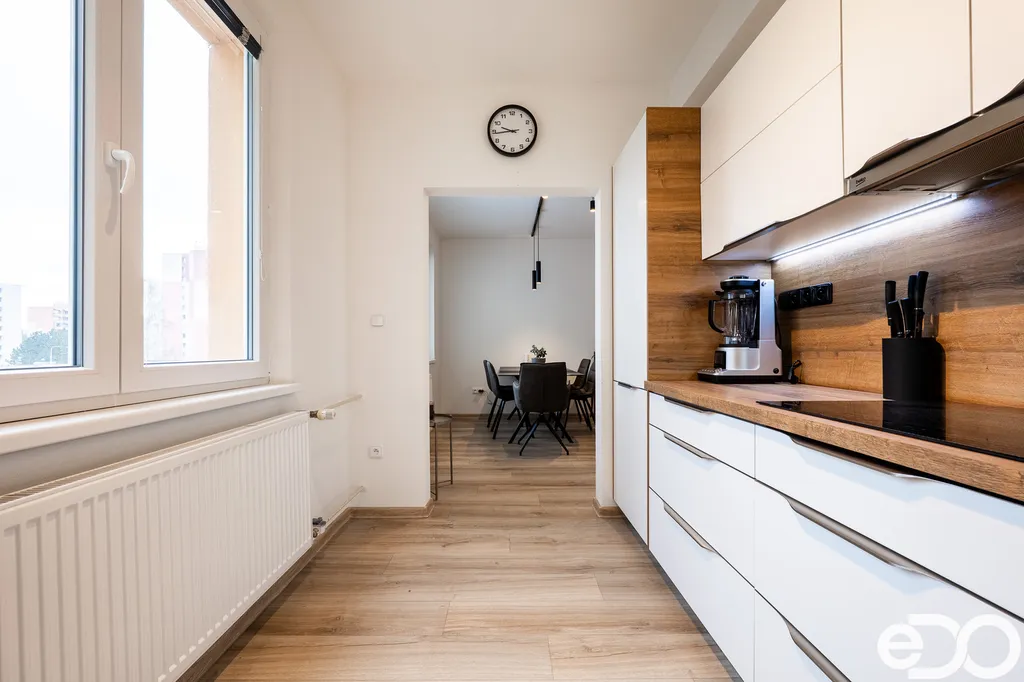 Nabízíme k prodeji krásný a vzdušný byt o užitné ploše cca 74 m2, umístěný v pátém patře panelového domu. Byt prošel nákladnou a velmi zdařilou rekonstrukcí, v rámci které došlo také ke změně dispozic, což mu dodalo moderní a funkční uspořádání. Dispozice bytu je 4+1+ technická místnost ( šatna). Nová kvalitní kuchyňská linka s ještě nepoužitými spotřebiči - varná deska, el. trouba, mikrovlnná trouba, lednice s mrazákem a odsavač par. Koupelna se sprchovým koutem i vanou. Samostatná toaleta. Z ložnice je vstup na lodžii. Z chodby se vchází do samostatných dětských pokojů a technické místnosti nebo šatny.