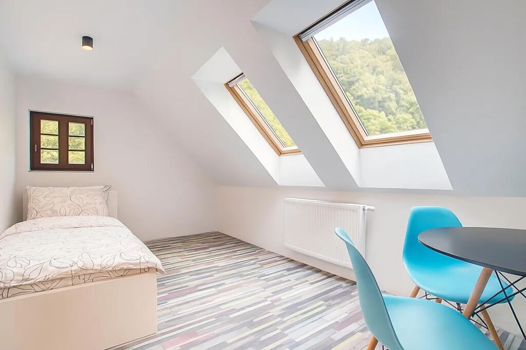 K dispozici jsou celkem 3 ložnice, půda, světlý obývací prostor s kuchyňským koutem, moderní koupelna s WC, velký prostor v přízemí s přípravou pro kuchyň, 3x WC, technické zázemí a dostatek úložných prostor. Interiér doplňují dřevěné trámy, stylové dveře a dostatek přirozeného světla díky střešním i klasickým oknům.