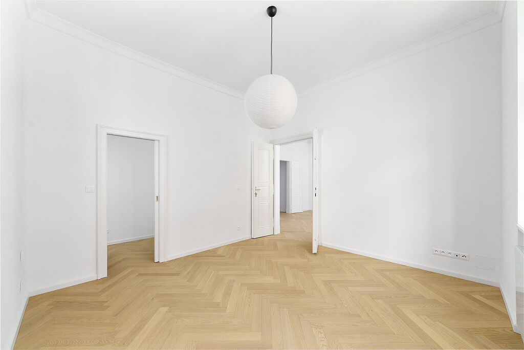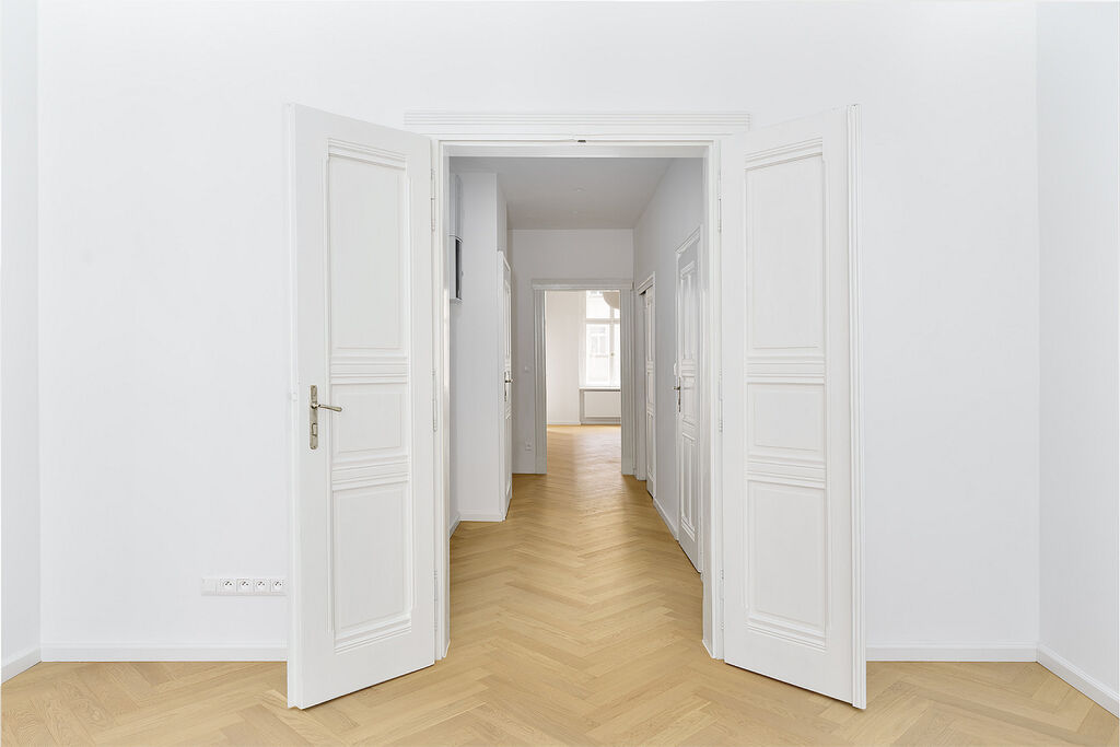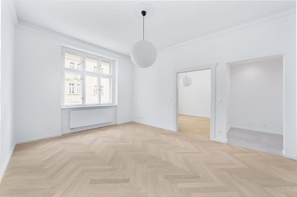 Mezi standardy bytu patří dřevěné podlahy v parketovém vzoru, kvalitní keramická dlažba a moderní sanita. Samozřejmostí jsou špaletová dřevěná okna a historické dveře, které dodávají bytu šarm a atmosféru.