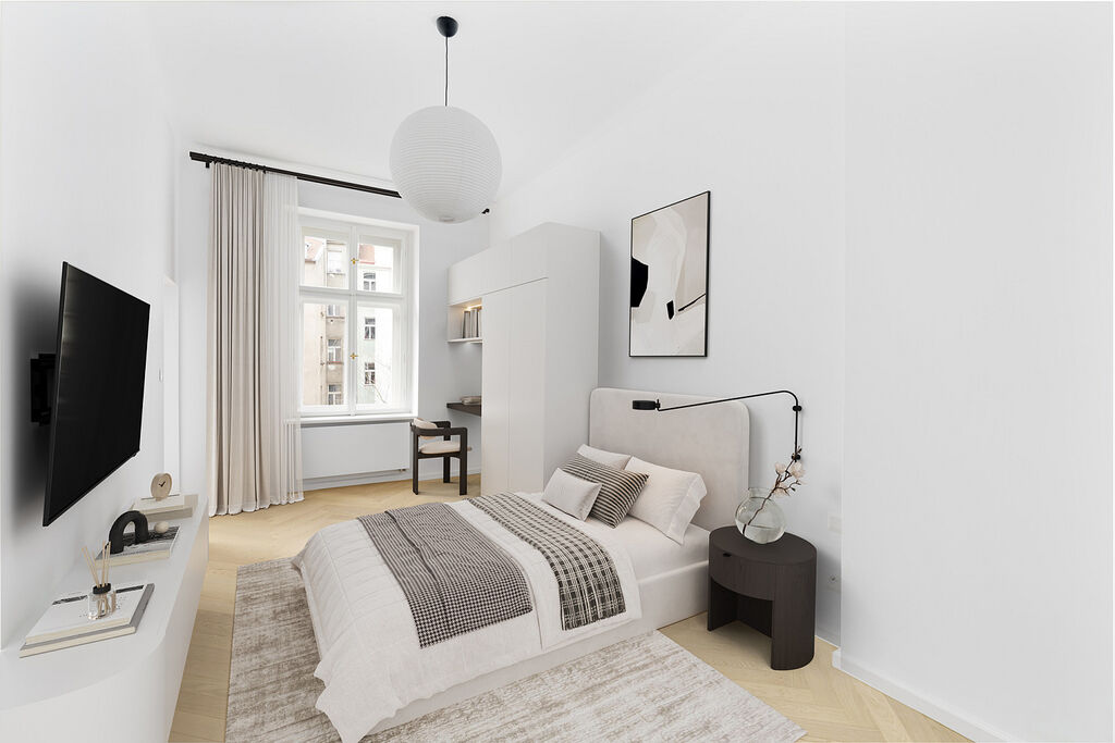 Tento byt prošel nákladnou a esteticky náročnou kompletní rekonstrukcí a je nabízen ve stavu white wall. Součástí bytu je ložnice se šatnou, prostorný a světlý obývací pokoj s kuchyňským koutem, chodba, technická místnost, koupelna a samostatná toaleta. Dále je zde pokoj, který nabízí přístup na lodžii s výhledem do klidného vnitrobloku a zeleně.