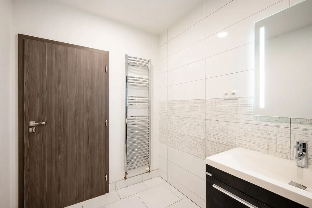 - koupelna se sprchovým koutem, umyvadlem, umyvadlovou skříňkou, zrcadlem a topným žebříkem (7,0 m²)