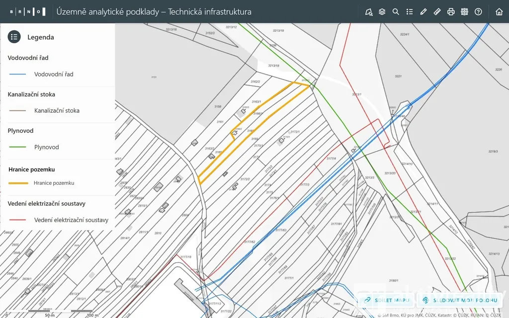 Inženýrské sítě – vodu a elektřinu lze přivést ze vzdálenosti cca 100 metrů jak k horní, tak k dolní hranici pozemku. Ze spodní strany je dostupný i plyn, odtud by šly přivést všechny sítě jedním výkopem. Kanalizace tu není, počítá se s jímkou, nebo domácí ČOV.
