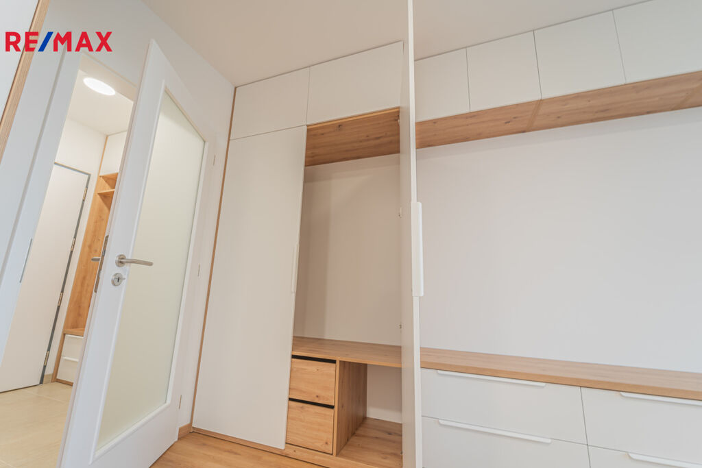 Byt je k pronájmu částečně vybavený nábytkem a elektrospotřebiči, jak můžete vidět na fotografiích – k dispozici je kuchyňská linka, lednice s mrazákem, varná deska, trouba, myčka, pračka a také komfortní šatní skříně u vstupu i v obývacím pokoji.