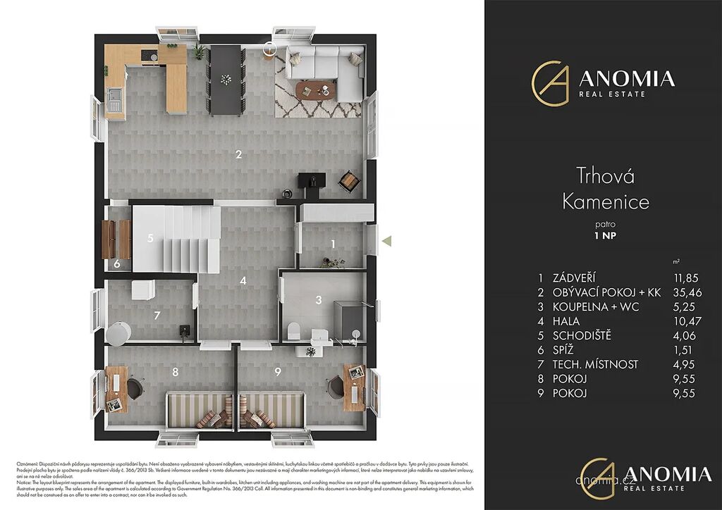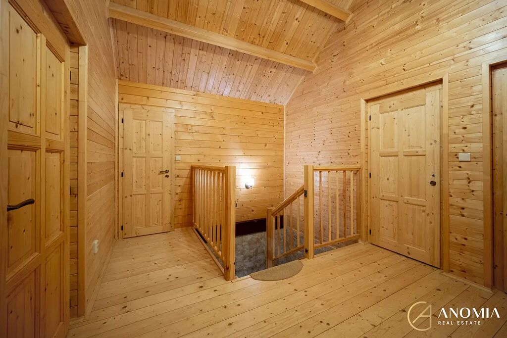 Dominantou přízemí je prostorný obývací pokoj, z kterého je přímý výstup na terasu. Kuchyně je ve venkovském, moderním stylu a v kombinaci s dřevěnými stropy a krbovými kamny působí velice útulným dojmem. Spodní patro doplňují také dva pokoje. Do druhého patra vede elegantní dřevěné schodiště, odkud se dostanete do čtyř samostatných pokojů s krásnými výhledy do okolní přírody. Dům dále disponuje dvěmi koupelnami – jednou se sprchovým koutem a druhou s vanou, technickou místností a čtyřmi prostornými šatnami, které poskytují dostatek úložného prostoru.