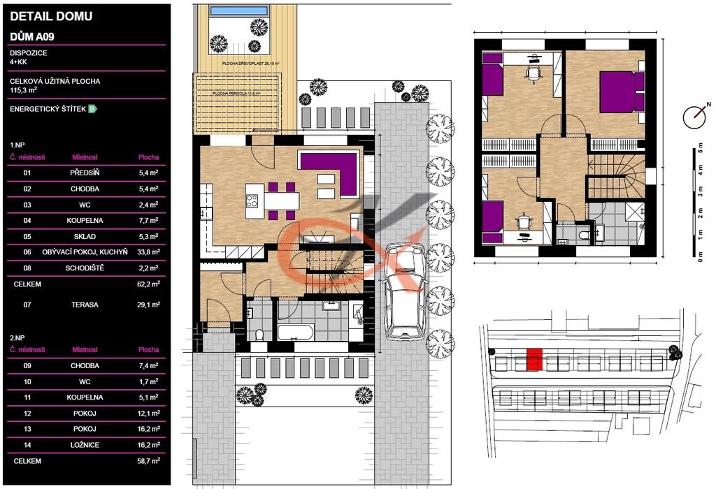Prodej řadového rodinného domu o zastavěné ploše 83m2 s pozemkem včetně zastavěné plochy 197m2, RD 09. Jedná se o dvoupodlažní skeletový dům o dispozici 4+kk , celková užitná plocha 116,3m2. Dům je situován na ulici Holešovská v nově vznikající lokalitě. V první fázi bude postaveno jedenáct rodinným domů, následně výstavba dalších šesti domů. V přízemí domu se nachází vstupní chodba, centrální chodba se schodištěm do patra domu, koupelna s vanou, samostatná toaleta, obývací pokoj propojený s kuchyní o výměře 34,8m2, z obývacího pokoje je vstup na venkovní terasu, pod schodištěm je komora. V patře domu jsou tři prostorné pokoje, dva o velikosti 16m2 a jeden 12m2, koupelna se sprchovým koutem, samostatná toaleta, prostorná chodba. V domě bude elektrické podlahové vytápění, příprava pro instalaci krbových kamen a vývod pro externí komín. Střešní krytina - plechové šablony, okna plastová trojskla, podlahy linoleum, vnitřní dveře včetně obložek, bojler pro ohřev teplé vody, koupelny budou vybaveny obklady, dlažbou a veškerou sanitou. Příjezd k domu bude řešen zámkovou dlažbou, což umožní vznik parkovacích stání podél domu. Dům bude napojen na veřejný vodovodní řád a kanalizaci, přístup bude zajištěn z obecní komunikace. Dům se nachází přibližně 900m od centra Fryštáku a 8 km (cca 15 minut autem) od Zlína. Dům je ve výstavbě, jeho dokončení je plánováno v prvním kvartálu roku 2026.