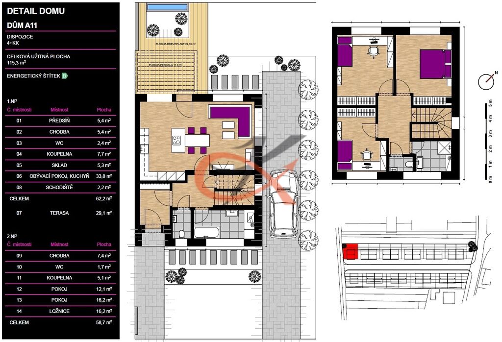 Prodej samostatně stojícího rodinného domu o zastavěné ploše 84m2 s pozemkem včetně zastavěné plochy 279m2, RD 11. Jedná se o dvoupodlažní skeletový dům o dispozici 4+kk , celková užitná plocha 116,3m2. Dům je situován na ulici Holešovská v nově vznikající lokalitě. V první fázi bude postaveno jedenáct rodinným domů, následně výstavba dalších šesti domů. V přízemí domu se nachází vstupní chodba, centrální chodba se schodištěm do patra domu, koupelna s vanou, samostatná toaleta, obývací pokoj propojený s kuchyní o výměře 34,8m2, z obývacího pokoje je vstup na venkovní terasu, pod schodištěm je komora. V patře domu jsou tři prostorné pokoje, dva o velikosti 16m2 a jeden 12m2, koupelna se sprchovým koutem, samostatná toaleta, prostorná chodba. V domě bude elektrické podlahové vytápění, příprava pro instalaci krbových kamen a vývod pro externí komín. Střešní krytina - plechové šablony, okna plastová trojskla, podlahy linoleum, vnitřní dveře včetně obložek, bojler pro ohřev teplé vody, koupelny budou vybaveny obklady, dlažbou a veškerou sanitou. Příjezd k domu bude řešen zámkovou dlažbou, což umožní vznik parkovacích stání podél domu. Dům bude napojen na veřejný vodovodní řád a kanalizaci, přístup bude zajištěn z obecní komunikace. Dům se nachází přibližně 900m od centra Fryštáku a 8 km (cca 15 minut autem) od Zlína. Dům je ve výstavbě, jeho dokončení je plánováno v prvním kvartálu roku 2026.