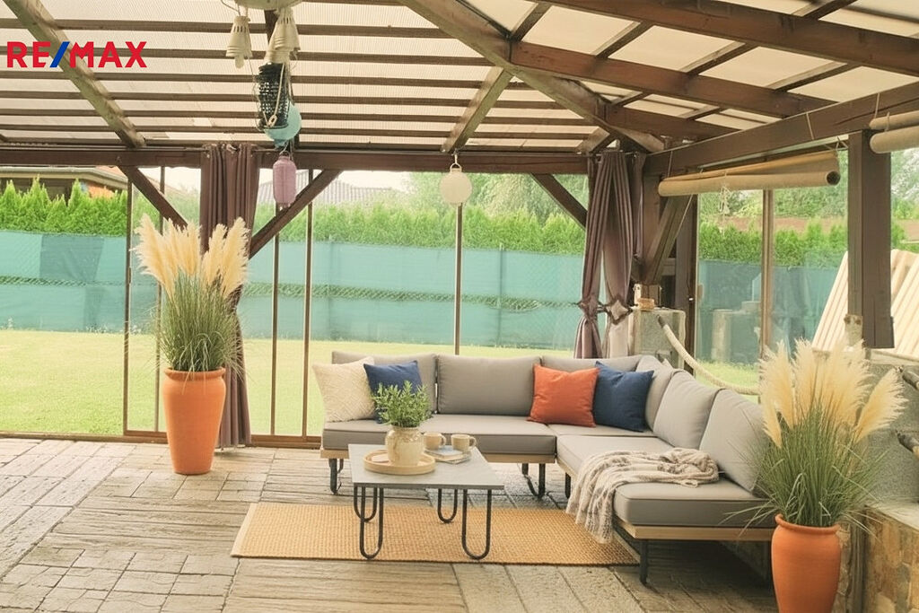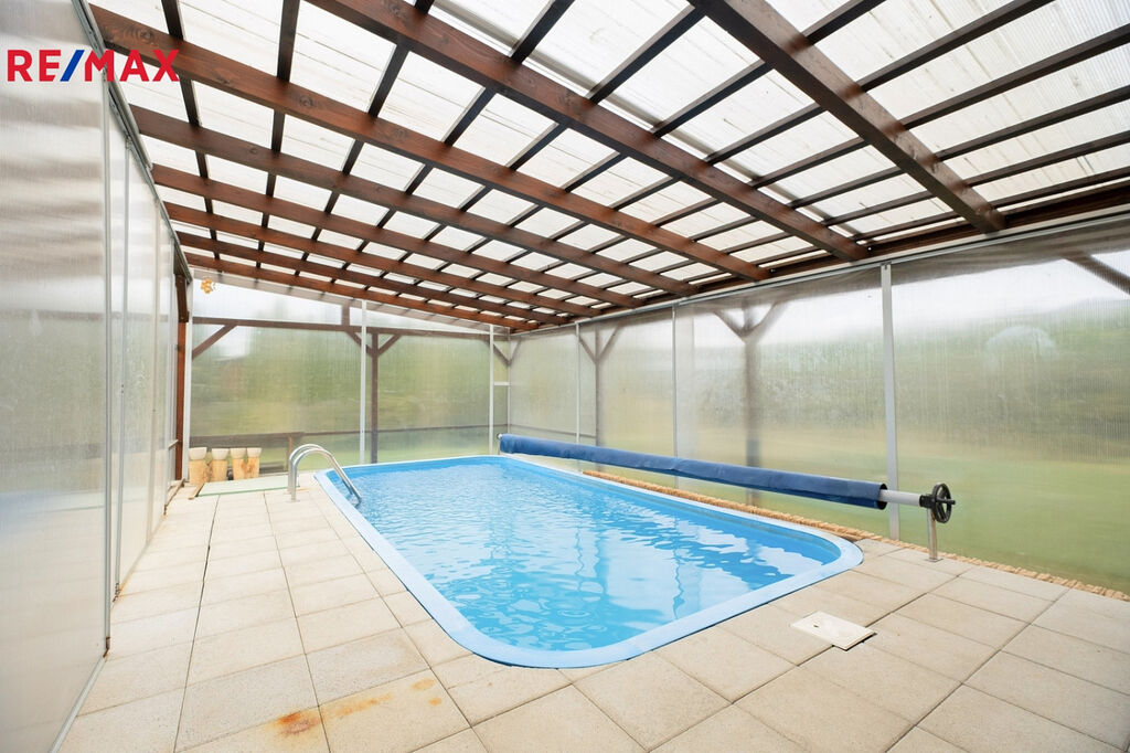 Zděný dům má užitnou plochu 138 m². Dominantou je prostorný obývací pokoj s přímým vstupem na zastřešenou terasu o přibližné velikosti 50 m² nebo ke krytému bazénu o rozměrech 3 × 6 metrů. Bazén se slanou vodou je vyhřívaný tepelným čerpadlem, takže si můžete užít koupání i mimo hlavní sezónu. Tato kombinace vytváří skvělé zázemí pro celoroční relax a soukromí.