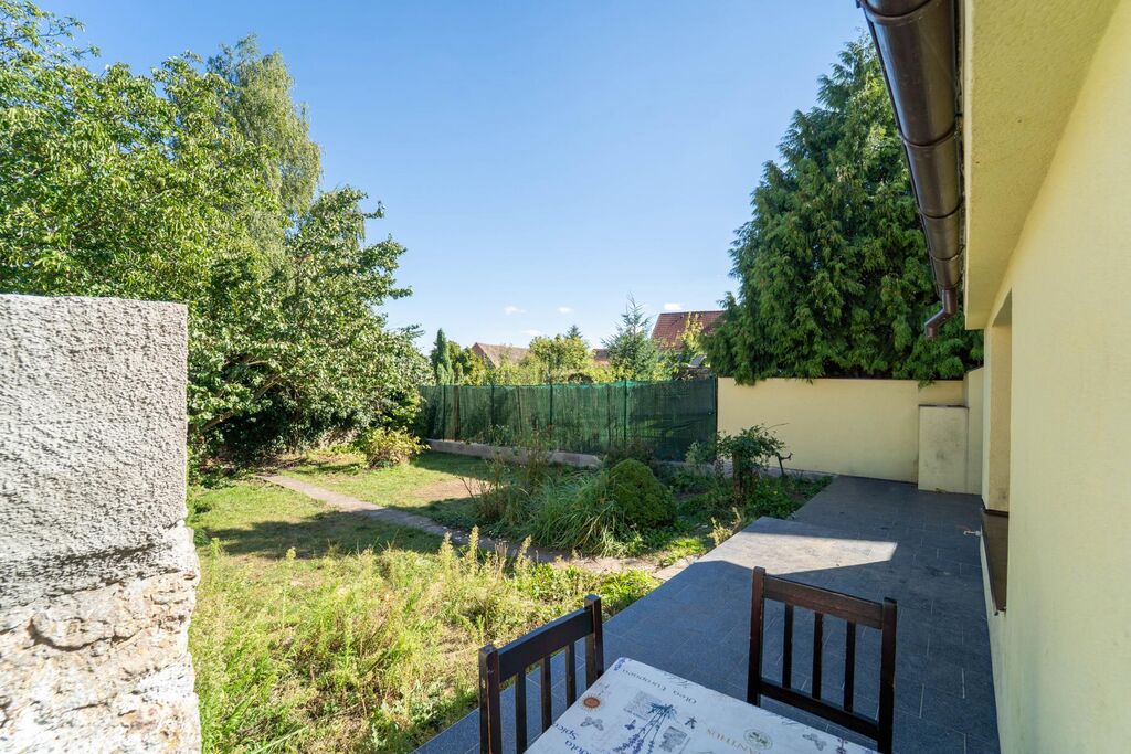 Za domem je prostorná terasa pro venkovní posezení a útulná zahrada společná pro oba byty v domě.