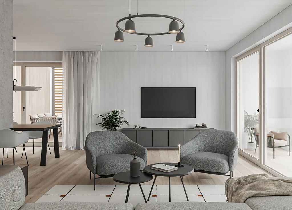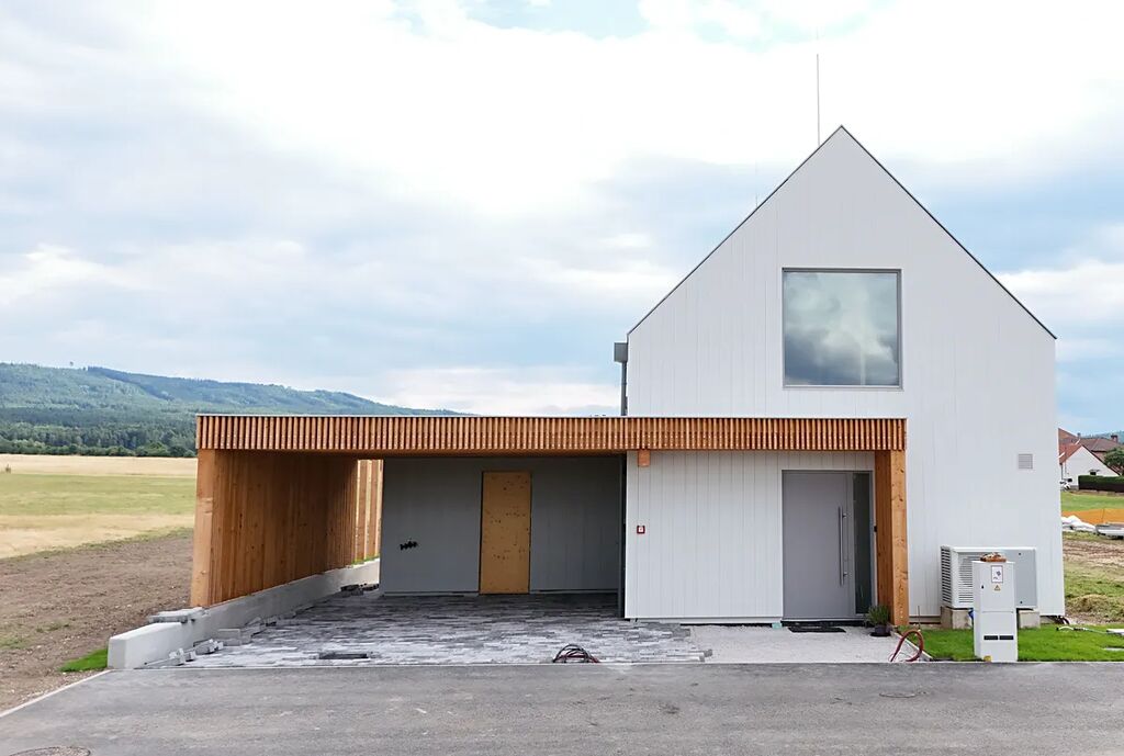 Díky velkým proskleným plochám a posuvným portálům se dům přirozeně otevírá do zahrady, která plynule přechází do okolní přírody. Dvě prostorné terasy nabízejí ideální prostor pro relaxaci, grilování nebo ranní kávu s výhledem do zeleně. Součástí pozemku je i krytý přístřešek pro dvě auta s přípravou na nabíječku pro elektromobil a s integrovanou kolnou třeba na zahradní nářadí či zimní kola od aut.