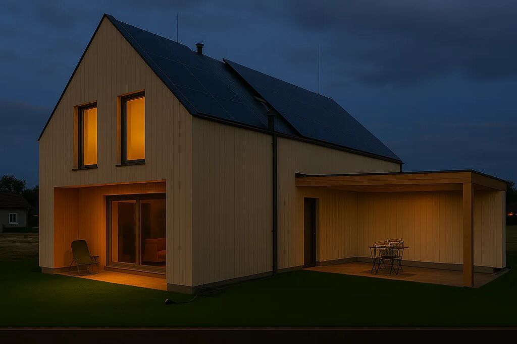 Tato dvoupodlažní dřevostavba je postavena z CLT panelů Novatop => žádné lehké duté OSB stěny, ale poctivé masivní dřevo. Fasáda a střecha jsou provětrávané, izolované přírodním dřevovláknem => žádný polystyren. Výsledkem je nízkoenergetický dům v energetické třídě A s velmi nízkými provozními náklady z udržitelných ekologických materiálů.