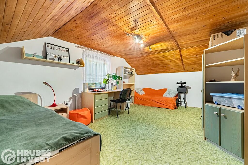 Schodiště z obývacího pokoje vede do patra, kde se nachází ložnice s vlastním WC a jeden další pokoj. V horním patře jsou parkety, které prostoru dodávají teplo a příjemnou atmosféru.