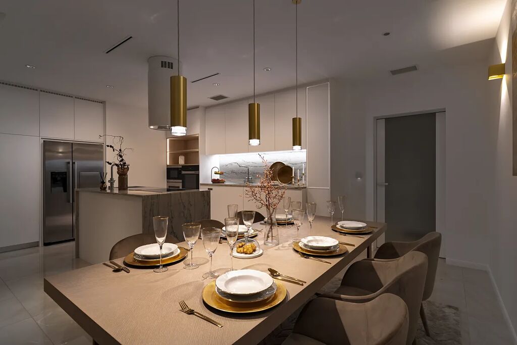 Výjimečné gurmánské zážitky vás čekají v designové kuchyni o rozloze 36 m², která je spojena s jídelnou. Vybavena je kvalitními spotřebiči Bosch a Miele. Nechybí americká lednice, luxusní vestavné spotřebiče ani vlastní vinotéka.