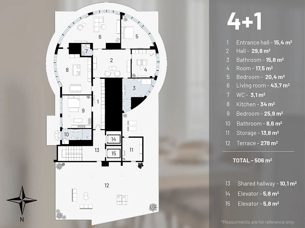 Tento luxusní střešní byt o výměře 228 m² se nachází ve 21. patře, které je tvořeno výhradně touto jednotkou. Má jedinečné dispozice 4+1 s prostornou halou a dvěma koupelnami. Disponuje také rozlehlou terasou o výměře 278 m², přístupnou z každého pokoje, vlastní kino místností a spa. Celý byt můžete dálkově řídit přes telefon odkudkoliv na světě díky inteligentní technologii Loxone.