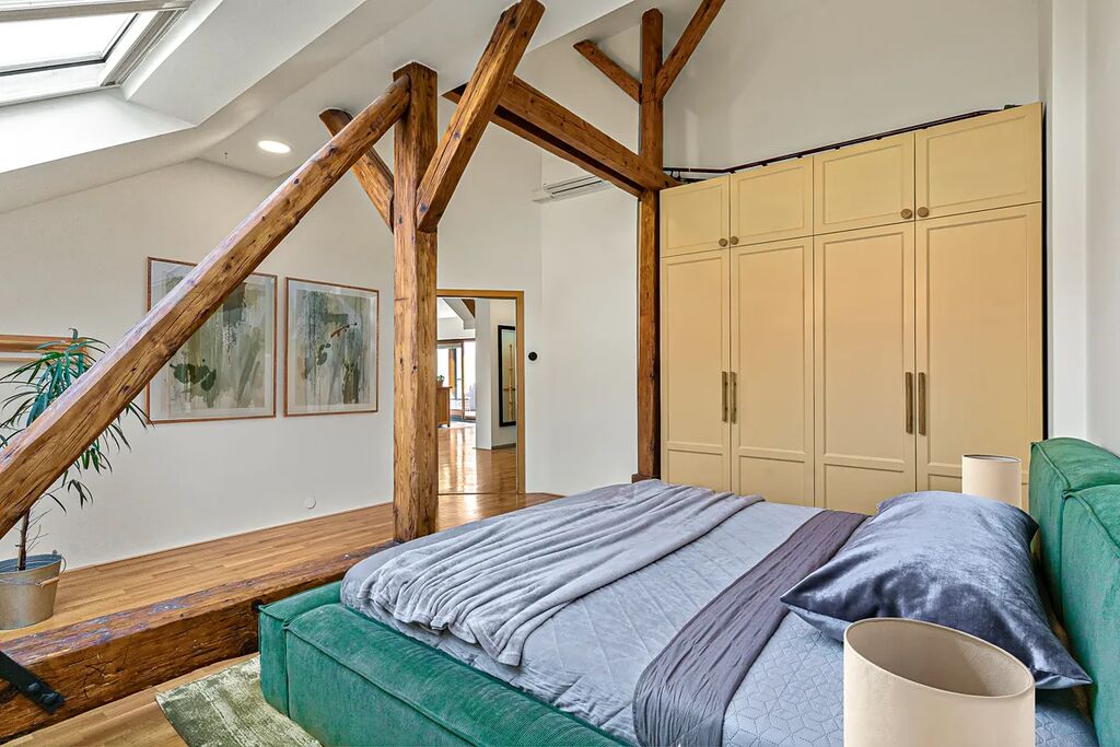 Vstoupíte – a okamžitě víte, že tento byt je jiný. Vysoké stropy, masivní trámy a světlo proudící střešními okny vytvářejí jedinečný prostor s duší. Když k tomu přidáte soukromou terasu, je jasné, že tohle je bydlení, které se nevidí každý den.