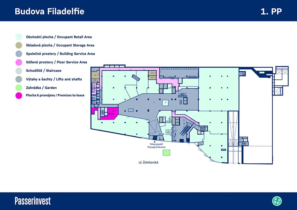 Nabízíme na pronájem atraktivní obchodní prostory o ploše 84 m2 se skladem o ploše 10 m2 v obchodní pasáži administrativní budovy Filadelfie, Praha 4, ul. Želetavská. Prostory orientované do obchodní pasáže jsou ideální pro obchod či službu, nejsou vhodné pro gastro provoz. V obchodní pasáži se nachází supermarket Albert, květinářství Romantika, zlatnictví a klenotnictví JK Jewels, holičství Better Barber, dámská móda Meera Design, kavárna Kofyka, restaurace Roast & Grill, Sushi Time Corner, Beauty Studio a cvičení Body Express. Budova Filadelfie disponuje veřejným podzemním parkovištěm, venkovní veřejný parking je pak přímo u budovy v ulici Želetavská. Filadelfie s pronajímatelnou plochou 34 000 m2 je sídlem společnosti UniCredit Bank s více než 2 000 zaměstnanci a dalších významných českých i mezinárodních firem. V okolí se nachází rezidenční zástavba a další administrativní budovy lokality Brumlovka, kde pracuje více než 13 tisíc lidí. Uvedené prostory jsou k dispozici ihned.