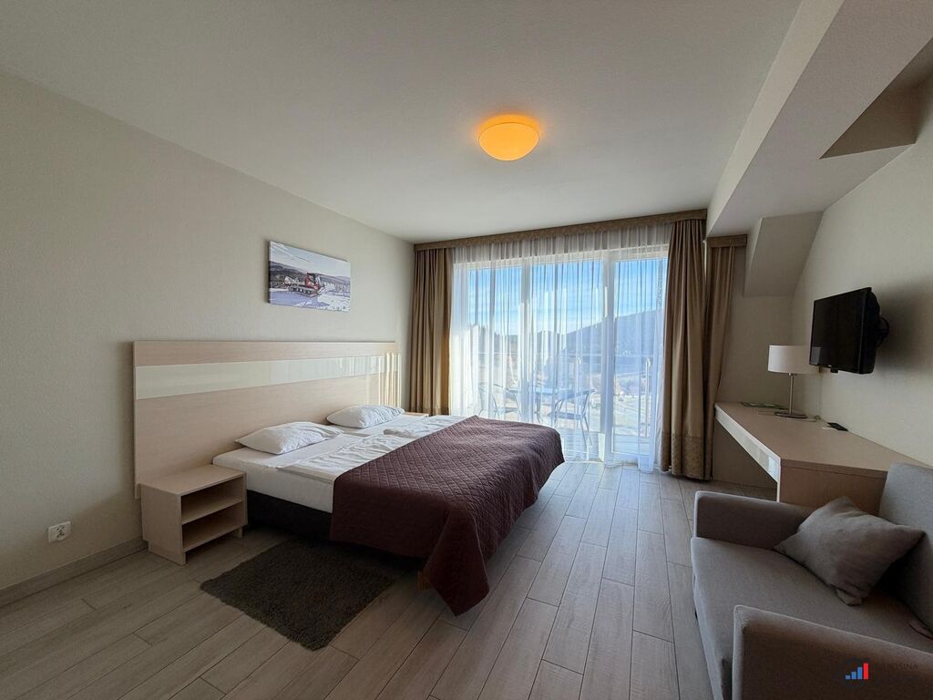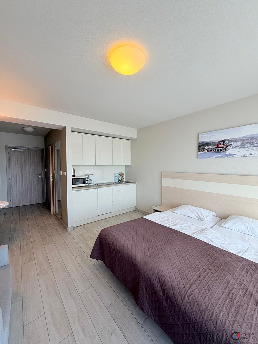 Na tomto krásném místě vám nabízíme apartmán o rozloze 27,5 m² sestávající z obývacího pokoje s kuchyňským koutem, ložnice, předsíně a koupelny. Z obývacího pokoje je vstup na balkon o velikosti 5,3 m², odkud je výhled na celý areál. V okolí se nachází restaurace, půjčovny sportovního vybavení a SPA zóna.