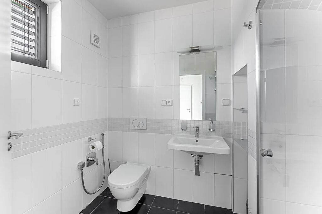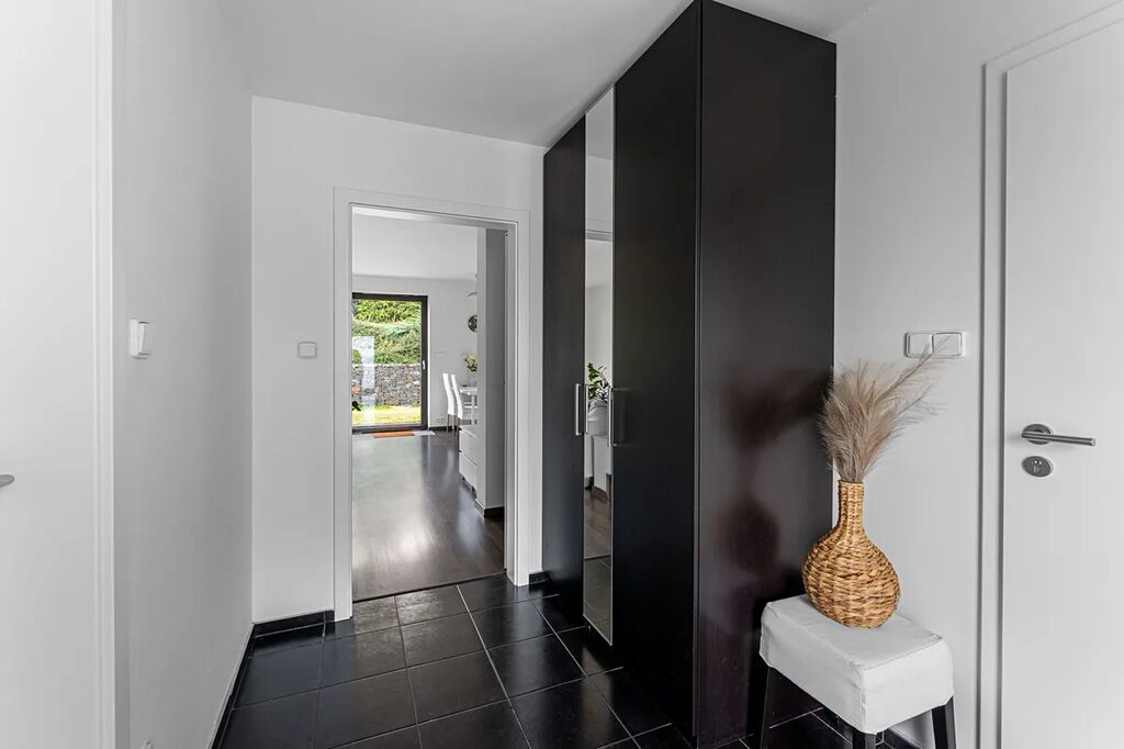 Kuchyně v elegantní bílé barvě je vybavena moderními vestavěnými spotřebiči, včetně lednice, mrazáku, varné desky, digestoře, elektrické trouby, mikrovlnné trouby a myčky. Dům je dále vybaven centrálním vysavačem venkovními žaluziemi s elektrickým pohonem, které zajišťují maximální komfort a úsporu energie. Podlahy jsou laminátové ve všech pokojích, zatímco v kuchyni, koupelnách a na chodbě najdete černou dlažbu.