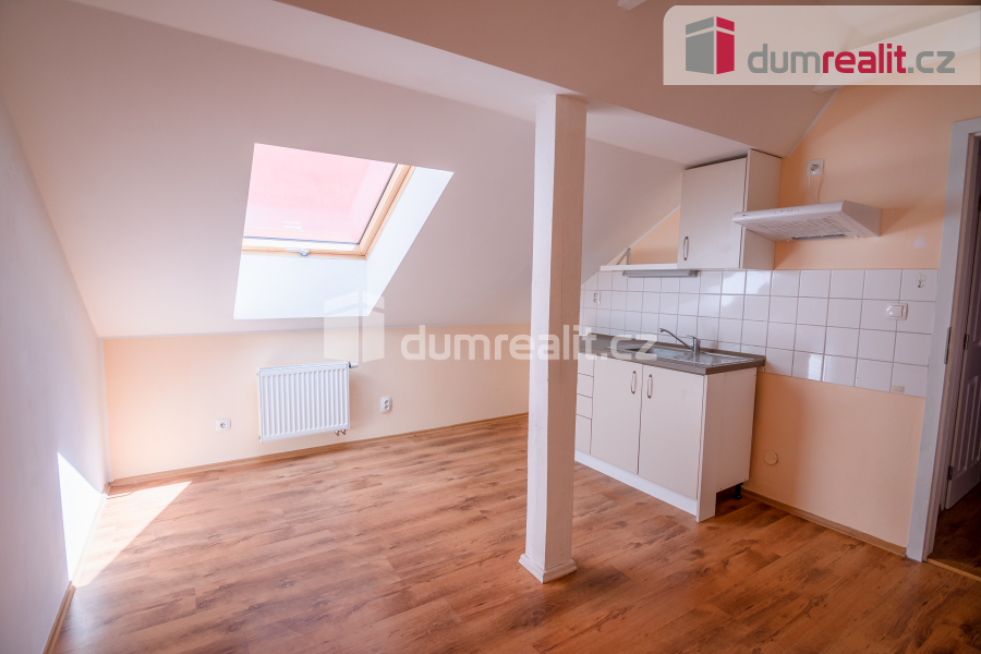 Dumrealit.cz Vám zprostředkuje pronájem podkrovního bytu 1+1 o výměře 53 m² ( 3.patro bez výtahu) v historickém domě v centru Kolína. Nájemné 12.000,- Kč./měs. + poplatky 4.000,- Kč. V této částce je zahrnuto: paušální částka za centrální vytápění 2.200,- Kč, záloha na vodu 800,- Kč a na vlastní smlouvu cca 1.000,- Kč elektřina ( ohřev vody bojlerem). Je vyžadována kauce 2 nájmy = tj. 24.000,- Kč, provize RK 12.000,- Kč +DPH (14.520,-Kč). Na fotografiích chybí elektrický sporák, který je součástí vybavení. Vhodné pro 1- 2 osoby. Ev. číslo: 653166.
