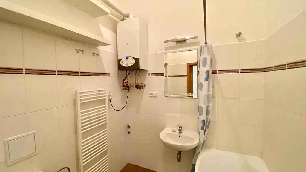 Plynový kotel pro vlastní vytápění a ohřev vody, radiátory, sanitární keramika a vodovodní baterie.