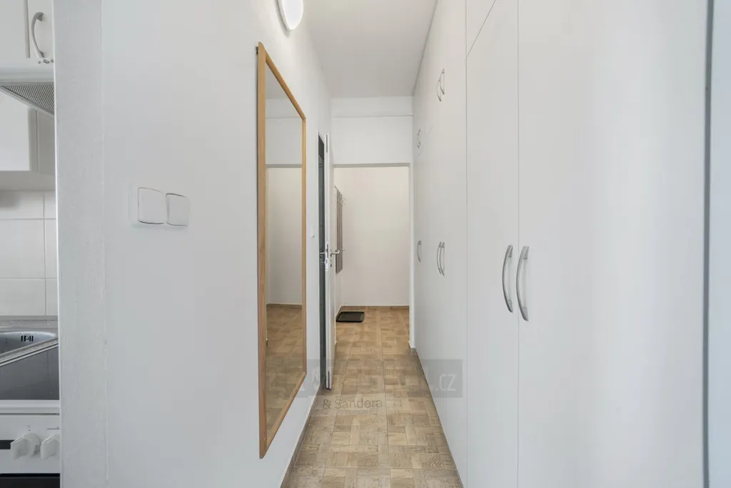 Po vstupu do bytu vás přivítá útulná předsíň s dostatkem prostoru pro úložné řešení. Odtud se vchází do samostatné kuchyně a dále do hlavního pokoje. Ten působí velmi vzdušně a díky své dispozici umožňuje pohodlné rozčlenění na obývací i spací část. Velkorysé množství denního světla podtrhuje příjemnou atmosféru celého bytu.