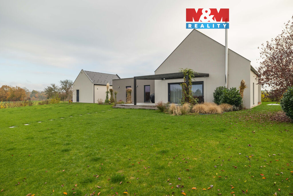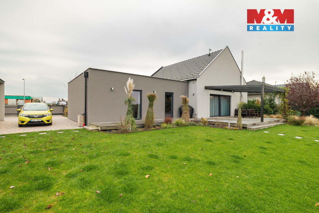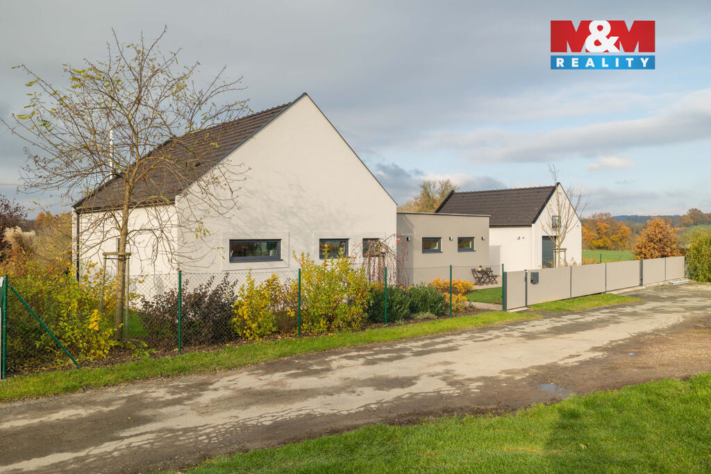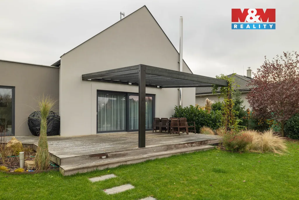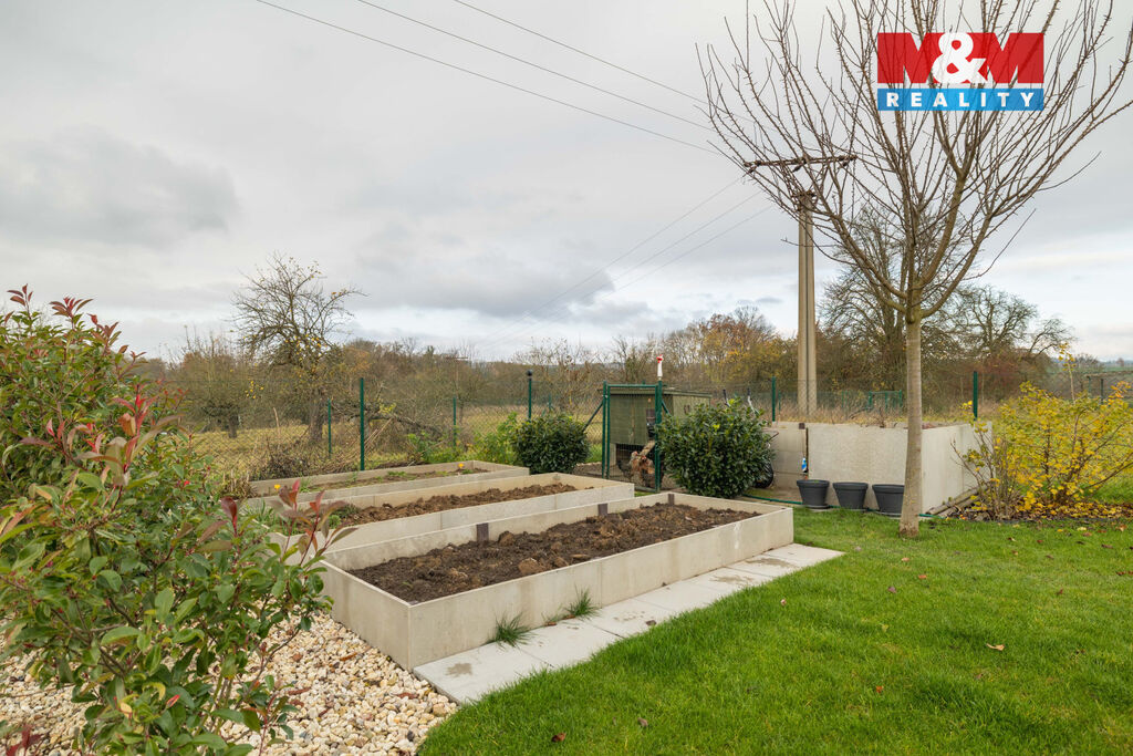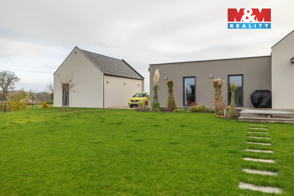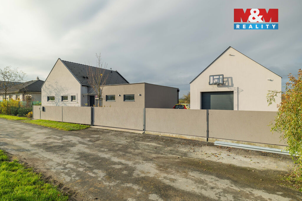 Součástí domu je garáž o velikosti 36 m² s elektricky ovládanými vraty a dílna (15 m²) vybavená dalším půdním prostorem (16 m²).Pozemek je kompletně oplocen — boční a zadní strany tvoří pletivo o výšce 1,5 m, přední část pak montované oplocení s elektricky ovládanou posuvnou bránou. Ráda vás domem provedu.