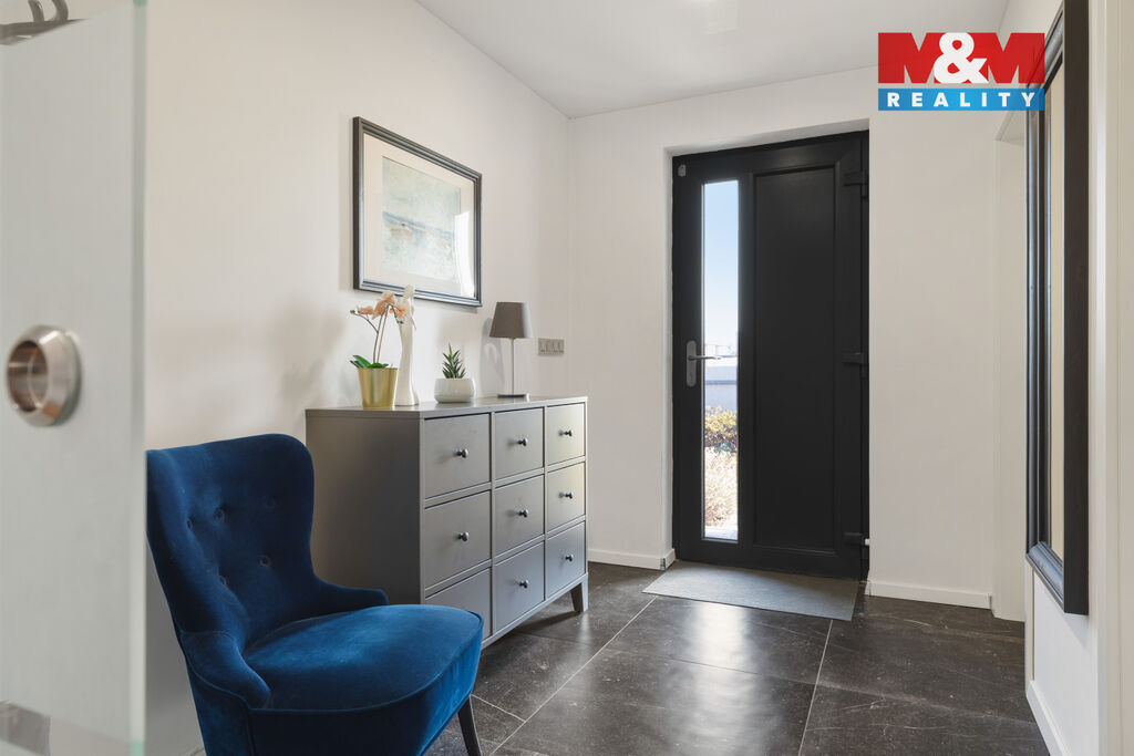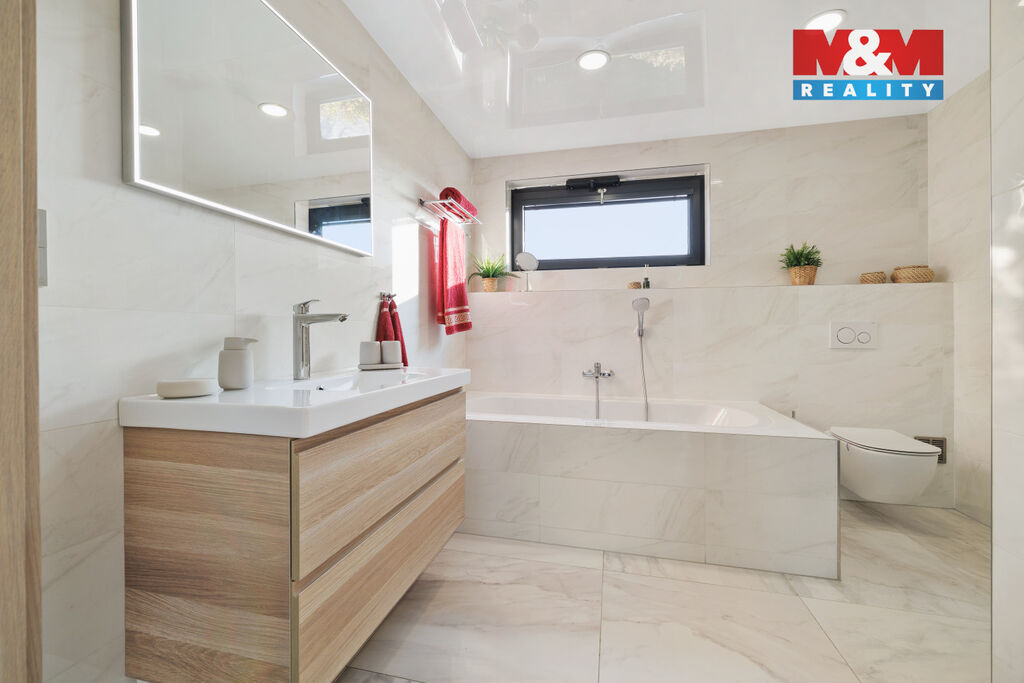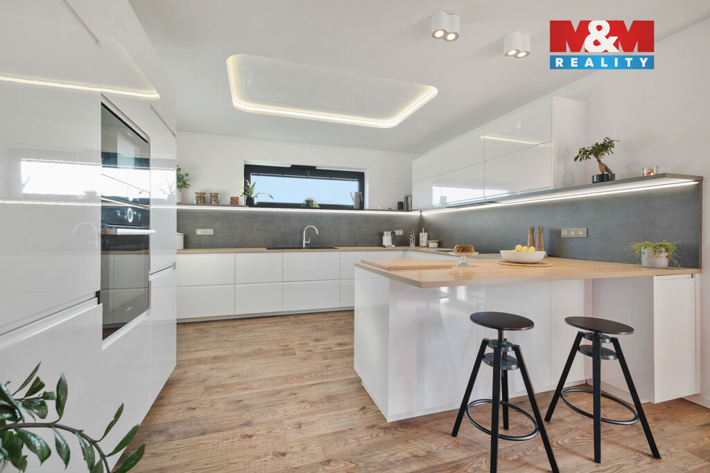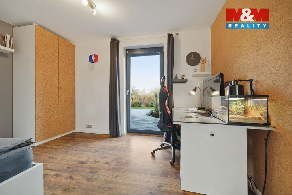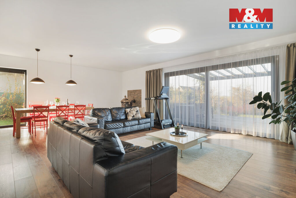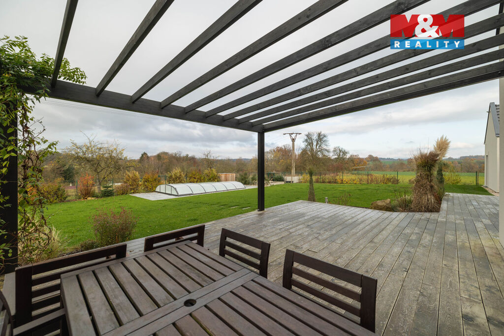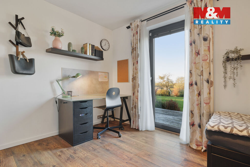 Součástí domu je garáž o velikosti 36 m² s elektricky ovládanými vraty a dílna (15 m²) vybavená dalším půdním prostorem (16 m²).Pozemek je kompletně oplocen — boční a zadní strany tvoří pletivo o výšce 1,5 m, přední část pak montované oplocení s elektricky ovládanou posuvnou bránou. Ráda vás domem provedu.