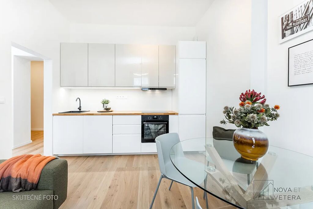 Vzhledem k tomu, že se na bytě právě dokončuje rekonstrukce, aktuální fotografie zatím nemáme – použité snímky jsou ilustrativní z jiného bytu se stejnými standardy. Byt se pronajímá nezařízený; nábytek z fotografií není součástí vybavení.