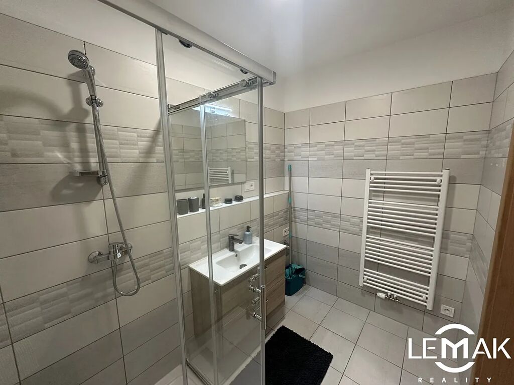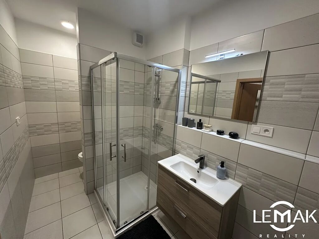 V koupelně se nachází sprchový kout, toaleta a otopný žebřík. Celý byt je navržen s důrazem na pohodlí a moderní design – v chodbě byla použita stylová šedá stěrka, v ložnici pak elegantní kamenný obklad. Terasa prošla nedávnou rekonstrukcí a byla osazena novou dlažbou.