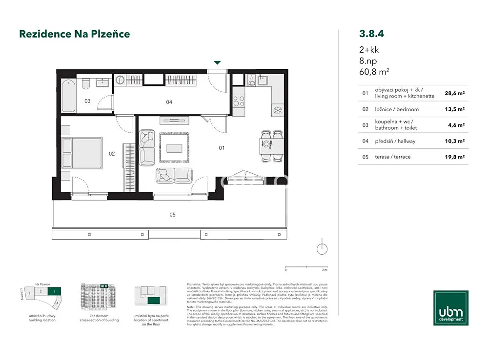 Na prodej nabízíme byt o dispozici 2+kk v 8. nadzemním podlaží, který má podlahovou plochu 60,8 m². K bytu náleží prostorná terasa o rozloze 19,8 m², který efektivně rozšiřuje obytný prostor do exteriéru a slouží jako ideální místo pro venkovní relaxaci a stolování. Jednotka je navržena pro efektivní a moderní bydlení s důrazem na funkčnost a dispoziční řešení maximalizující soukromí. Byt je řešen s ohledem na moderní standardy a poskytuje útulné a praktické zázemí pro jednotlivce či páry.