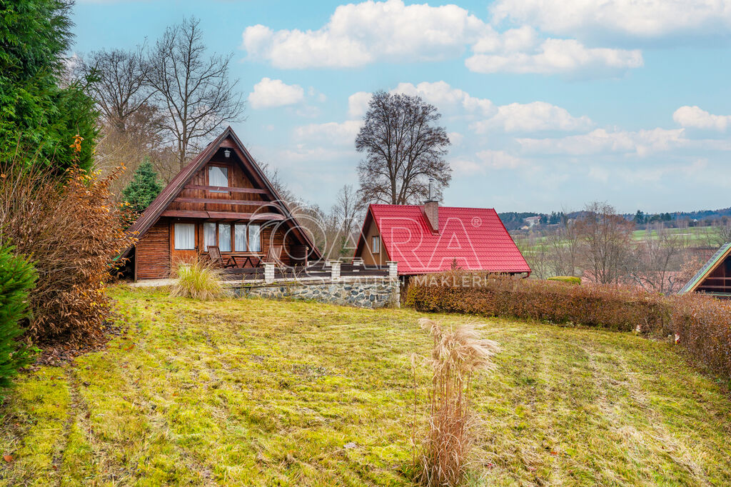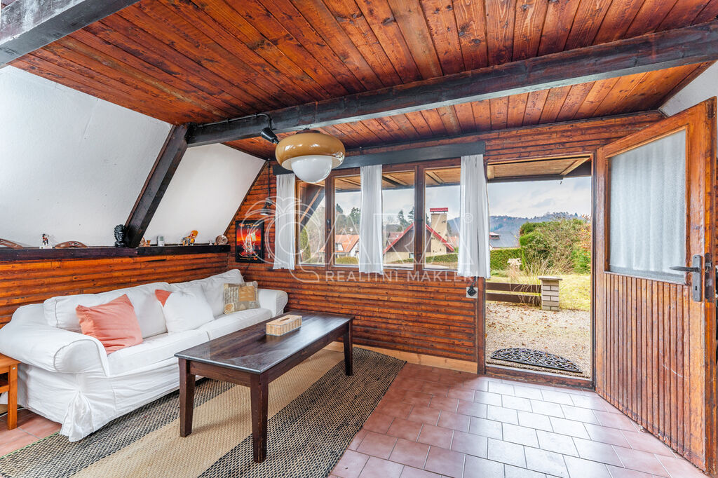 Prodej stylové dřevěné chaty na oblíbeném místě Slapy - osada Lahoz, v naprostém klidu a soukromí, díky umístění na konci slepé uličky. Chata je na vyvýšeném terénu, tudíž z pozemku a terasy je pěkný výhled do okolí. V přízemí se nachází obývací pokoj s krbovými kamny, kuchyňský kout, koupelna s WC a předsíň. V prvním patře pak ložnice opticky rozdělena na dvě části po dvou lůžkách a vstupem na balkon. Celá chata je podsklepena se vstupem z příjezdové cesty a prostor je rozdělen do několika částí - garáž/ úložné prostory, místnost pro posezení s krbem, sprcha a prostorná sauna. Do chaty je zavedena celoroční obecní voda a elektřina. Pohodlné parkování pro několik vozů přímo na pozemku.