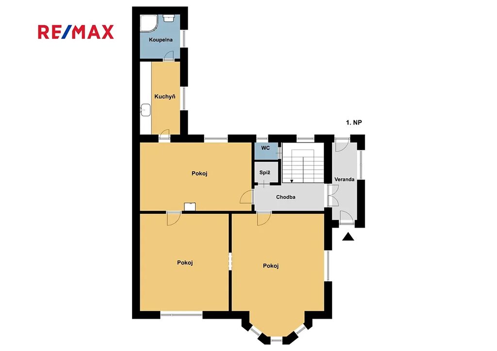 V 1.NP nalezneme vstupní chodbu, obývací pokoj, kuchyň, ložnici, samostatnou toaletu, spíž, prostornou koupelnu se sprchovým koutem a umyvadlem.