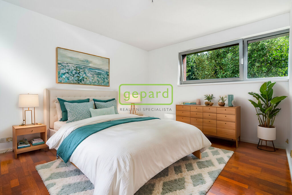Dispozičně, v přízemí, je v pravé části domu obývací pokoj s panoramatickým výhledem do zahrady, krbem, propojený s kuchyní. Kuchyň je vybavena spotřebiči Miele, Dornbrach a Gutmann a vlastní chlazenou spíží. Navazuje na jídelnu, pracovnu, dále na šatnu a sociální zázemí. Levá část domu, je oddělena garáží pro dva automobily, má vlastní vstup do samostatného bytu s obývacím pokojem s kuchyní, ložnicí a sociálním zázemím.