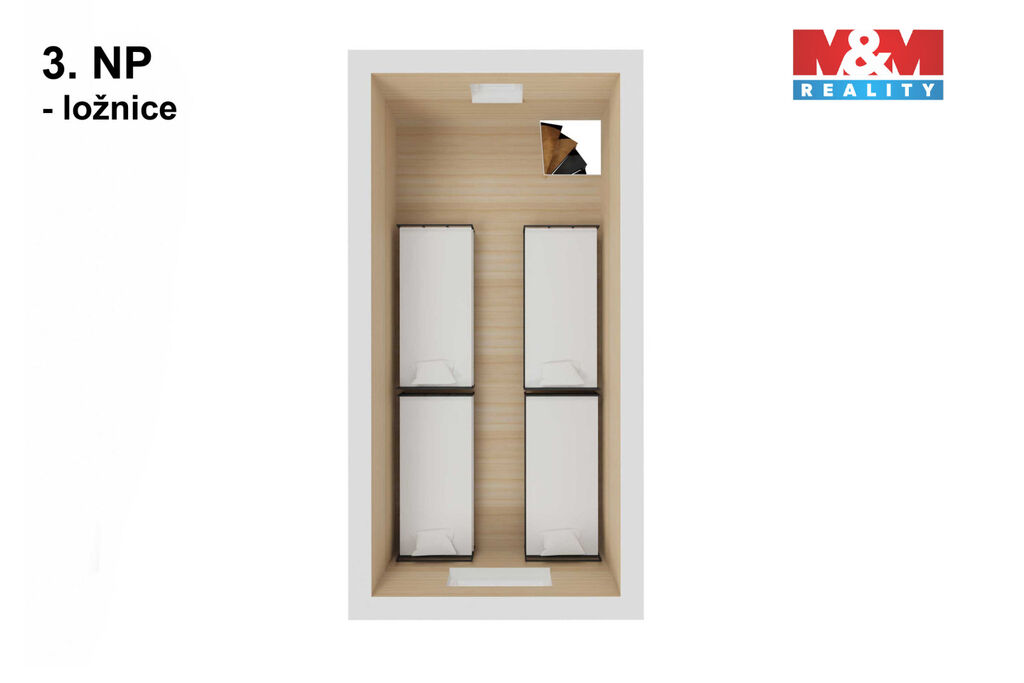 V prvním patře je útulný obývací pokoj s krbem, druhé WC a vstup do podkroví, které slouží jako ložnice.