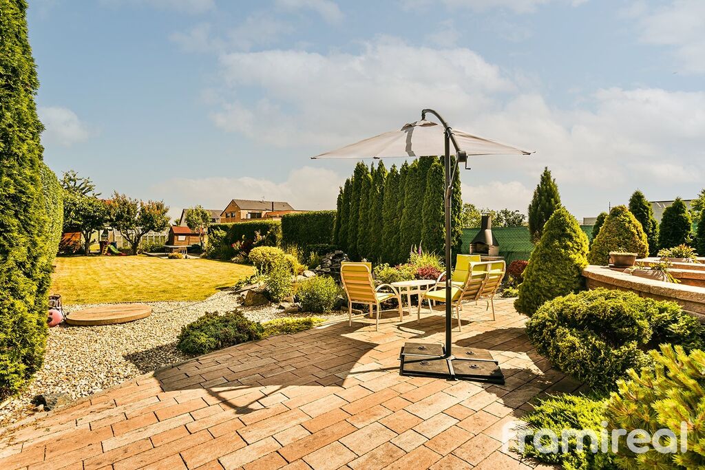 Zahrada je osázena vzrostlými dřevinami a nabízí soukromí i klid. Najdete zde jezírko s rybami, vlastní studnu a dva plodící ovocné stromy. Na pozemku je dostatek místa pro parkování několika vozidel.