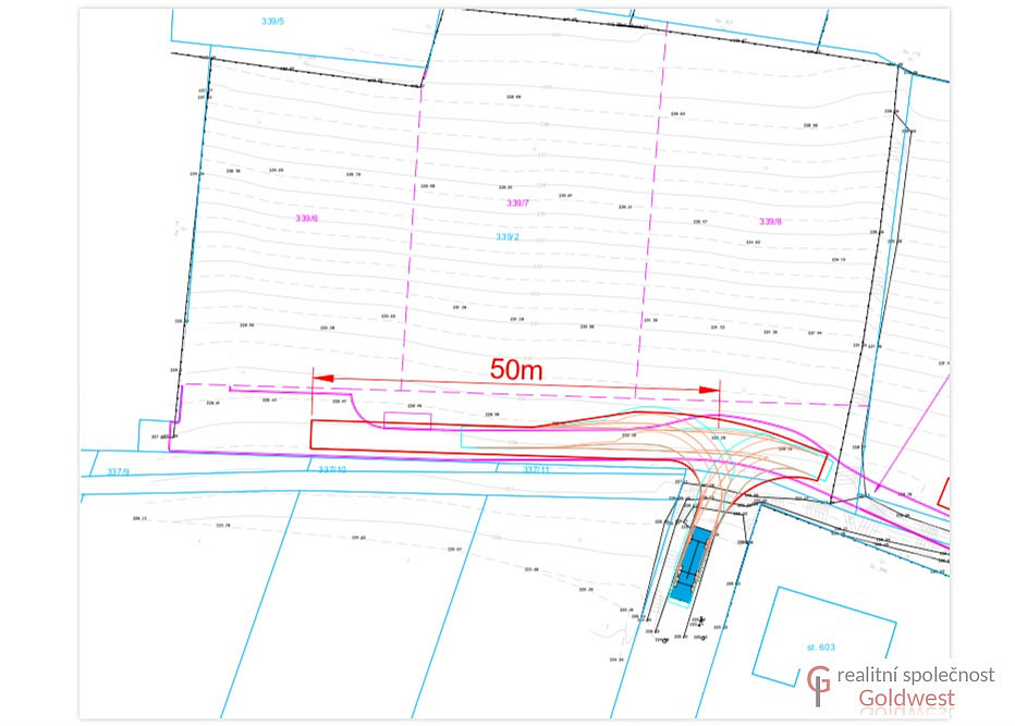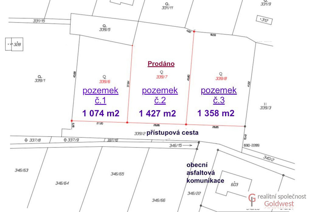 Dále je předmětem prodeje také podíl na pozemku 339/2 (o výměře 216 m²) zajišťující přístup k pozemku z obecní asfaltové komunikace. Zbudování zpevněného přístupu k jednotlivým pozemkům je zahrnuto v ceně a jeho realizace právě probíhá. Celkem je tedy k prodeji 1 290 m².