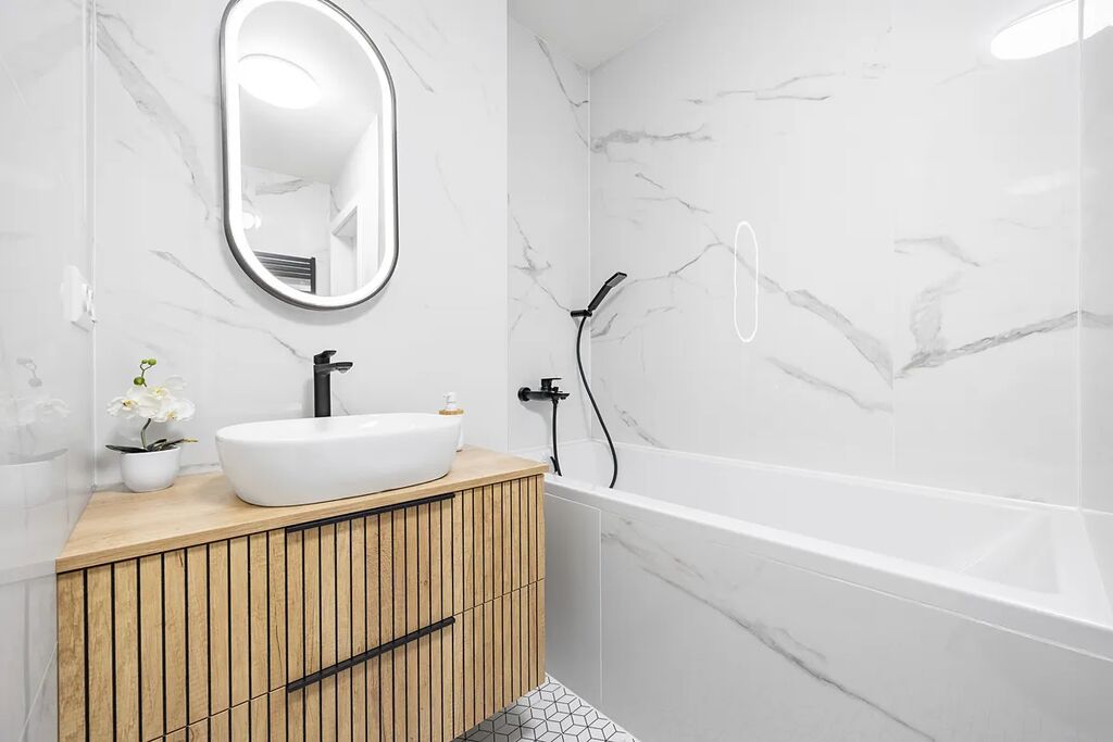 - nová sanita (vana, sprcha, umyvadlo, skříňka, toaleta)