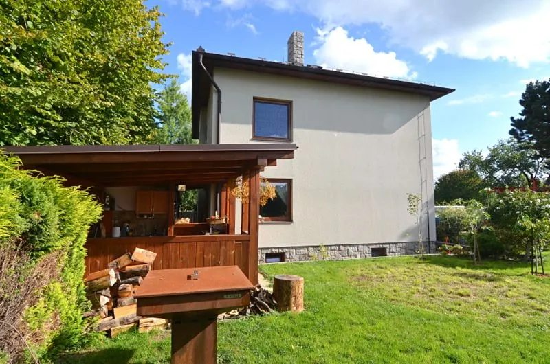 Pozemek rovinatý, oplocený se vzrostlými stromy, okrasnou zahradou a se zastřešeným sezením, které je ideálním místem pro oddych a relaxaci. Vjezdová brána na mechanické otvírání. IS: kanalizace, městský vodovod, vlastní kopaná studna (16m) a nádrž na dešťovou vodu.