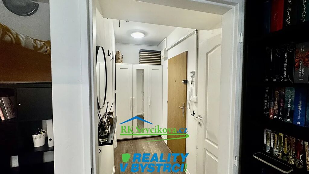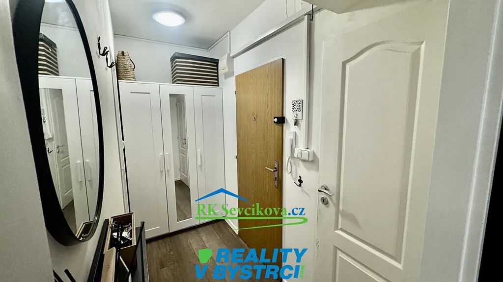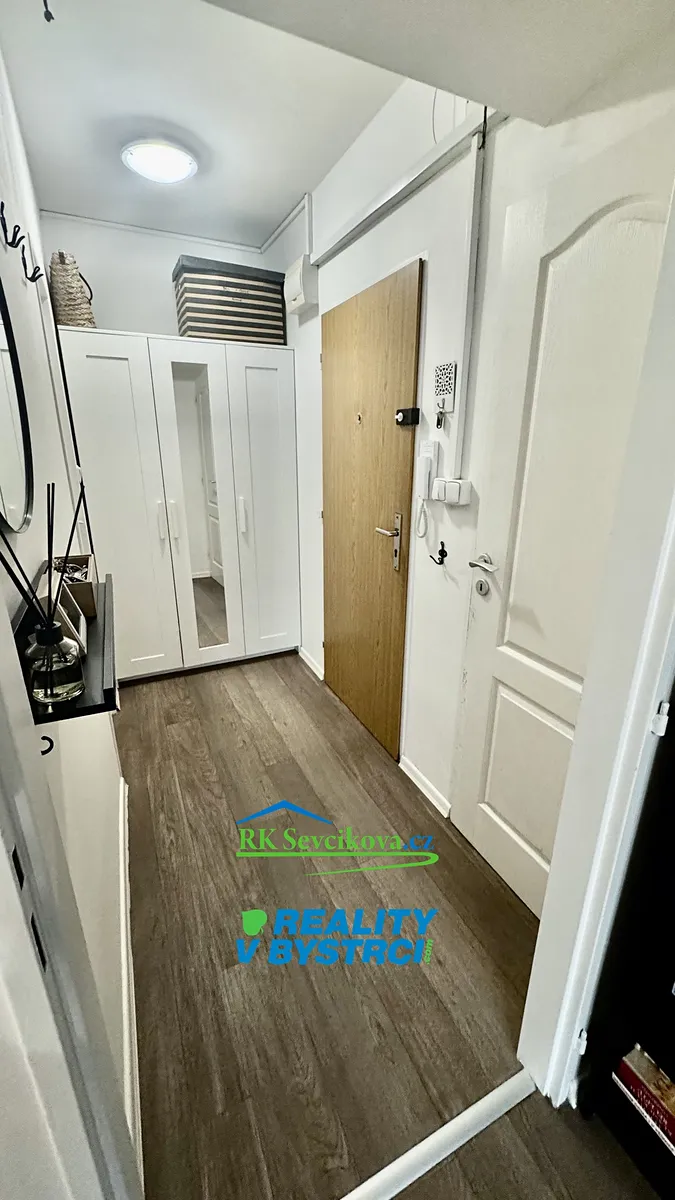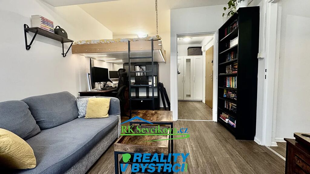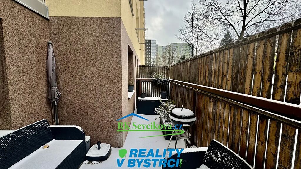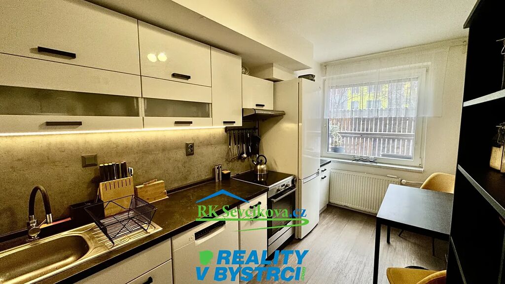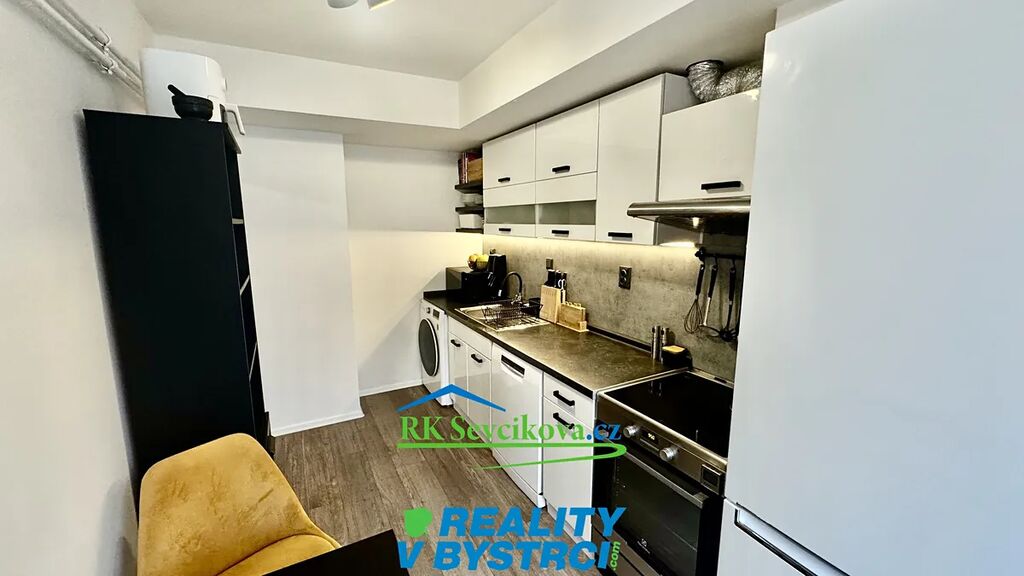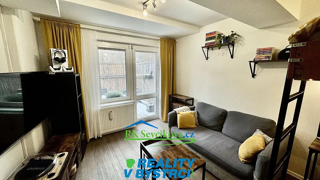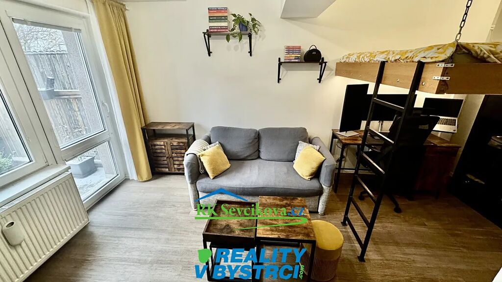 Nemovitost se skládá z předsíně o rozměru cca 3 m2, dále prostorné šatny 3,2 m2. Z předsíně je vstup do koupelny se sprchovým koutem, umyvadlem a WC o výměře 2,7 m2. V kuchyni, která má cca 11 m2 zůstává nová kuchyňská linka s myčkou a troubou, s indukční deskou a digestoří. V obývacím pokoji o výměře 15 m2 zůstává vyvýšená postel (pod ní je využit prostor jako pracovna). Z pokoje je vstup na zahrádku, kde je příjemné posezení, grilování a relaxace.