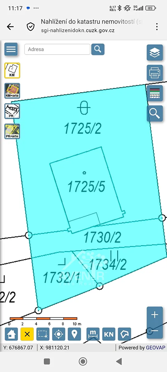 Velký pozemek za domem p. č. 1725/1 (10.388 m2) patří obci Nová Ves nad Nisou.