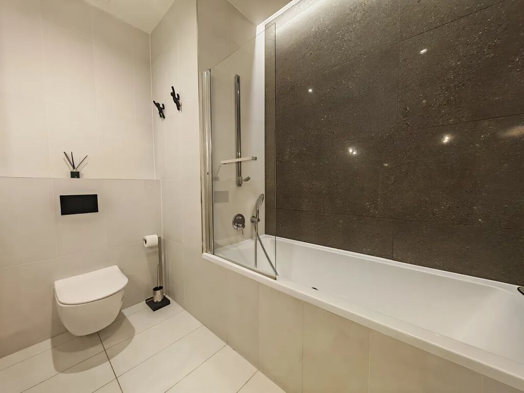 Interiér zaujme nadstandardní výškou stropů 3,05 m, která bytu dodává světlost a pocit vzdušnosti. Dispozice zahrnuje prostorný obývací pokoj s plně vybavenou kuchyní (včetně všech spotřebičů a vinotéky), samostatné WC pro hosty a koupelnu s vanou.