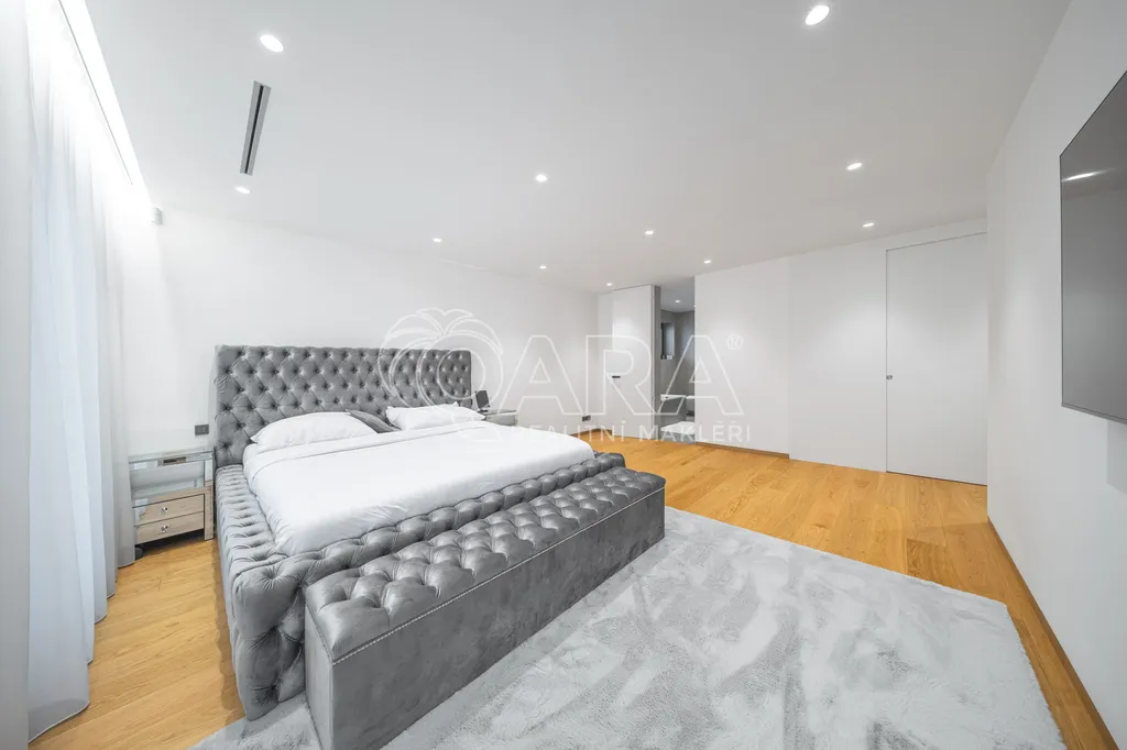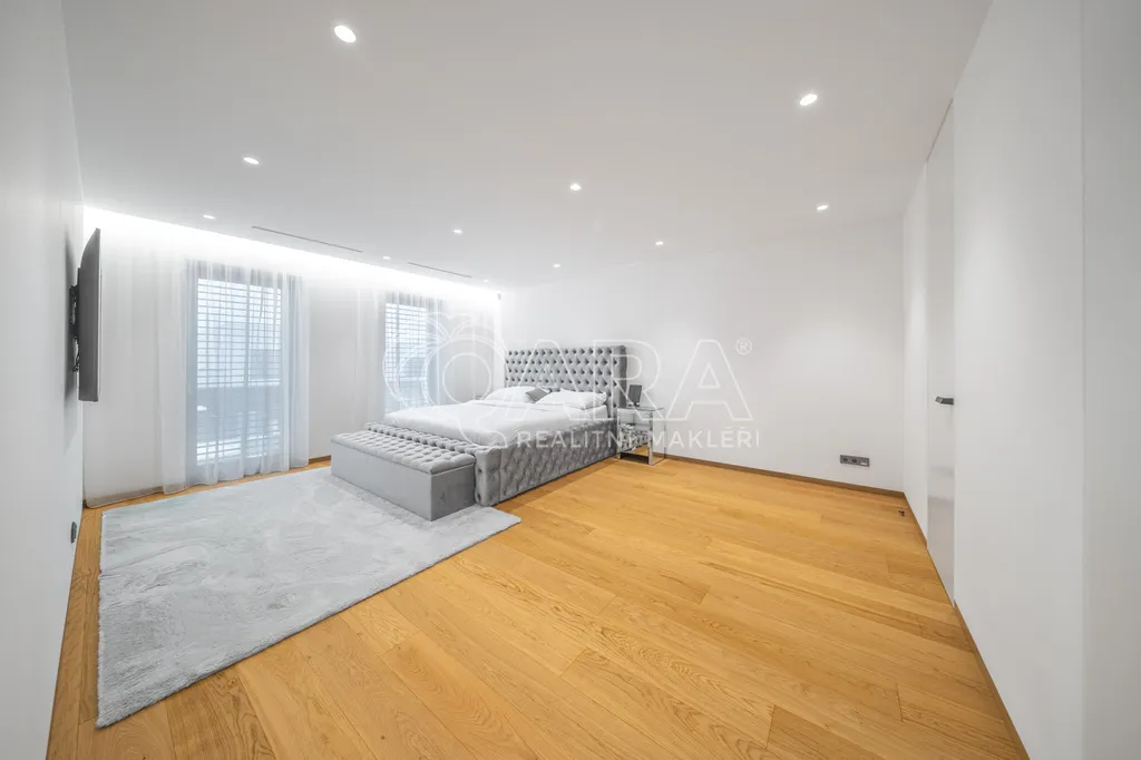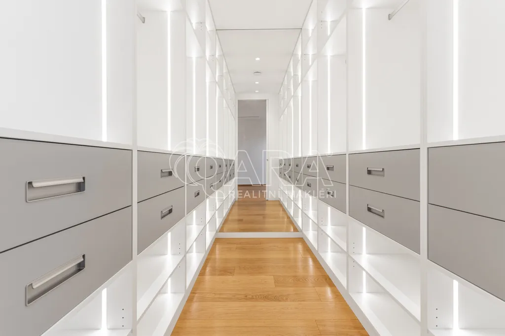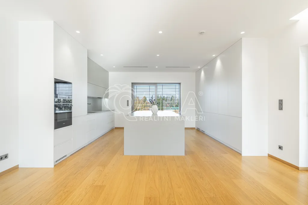 The generous 313 m² layout provides spacious interiors with an emphasis on design and functionality. Suitable both for family living and for representative purposes. High-quality materials, underfloor heating, ventilation system, concealed door frames and floor-to-ceiling doors, bathrooms with luxurious fittings, and a swimming pool.