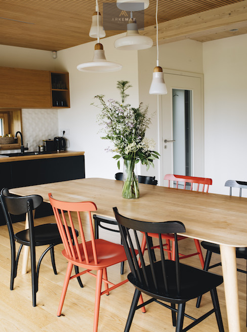 Provětrávaná fasáda ze severského modřínu zajišťuje, že nedochází k problémům s vlhkostí a přispívá k dlouhodobé životnosti stavby. Toto perfektně zapadá do rázu okolí. Části fasády doplňuje také fasádní omítka, která dotváří moderní vzhled domu. Kombinace těchto materiálů zajišťuje nejen atraktivní design, ale i funkčnost.