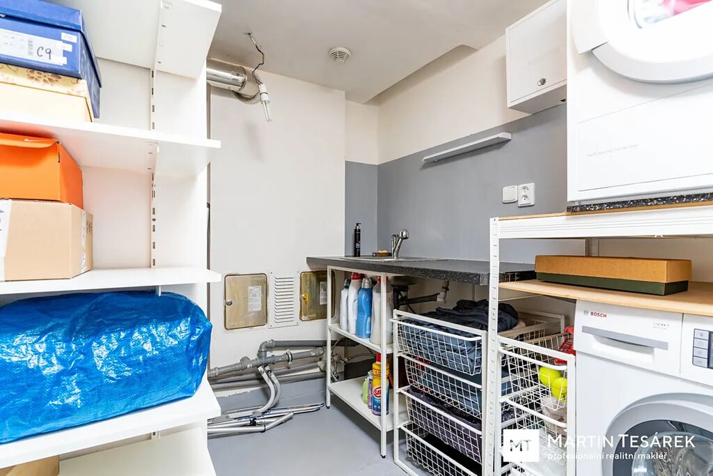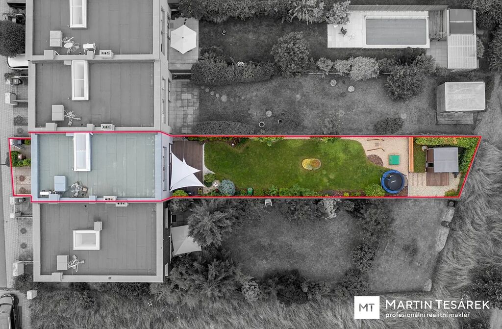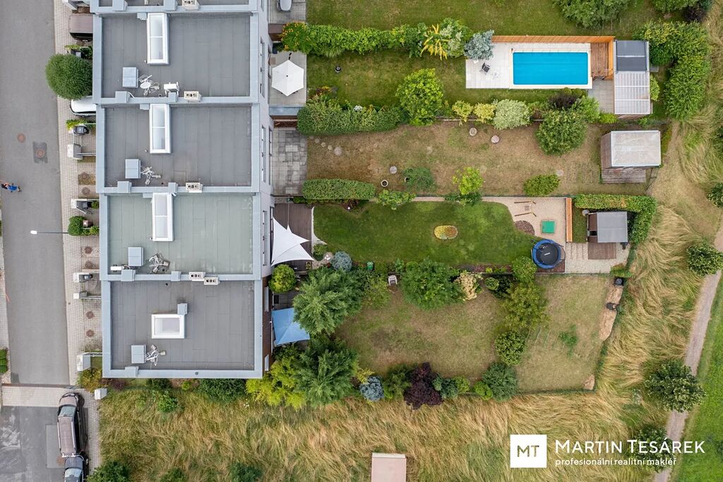 Řadový dům z roku 2009 se rozkládá ve třech podlažích. V suterénu se nachází garáž o rozměrech 2,7 × 3,7 m, prádelna a menší sklad. V přízemí je dominantním prvkem prostorný obývací pokoj s krbem a plně vybavenou moderní kuchyňskou linkou. Z obývacího pokoje je vstup na terasu a do krásně udržované a vzrostlé zahrady o výměře 207 m², orientované na východ. V přízemí se dále nachází spíž a samostatné WC.