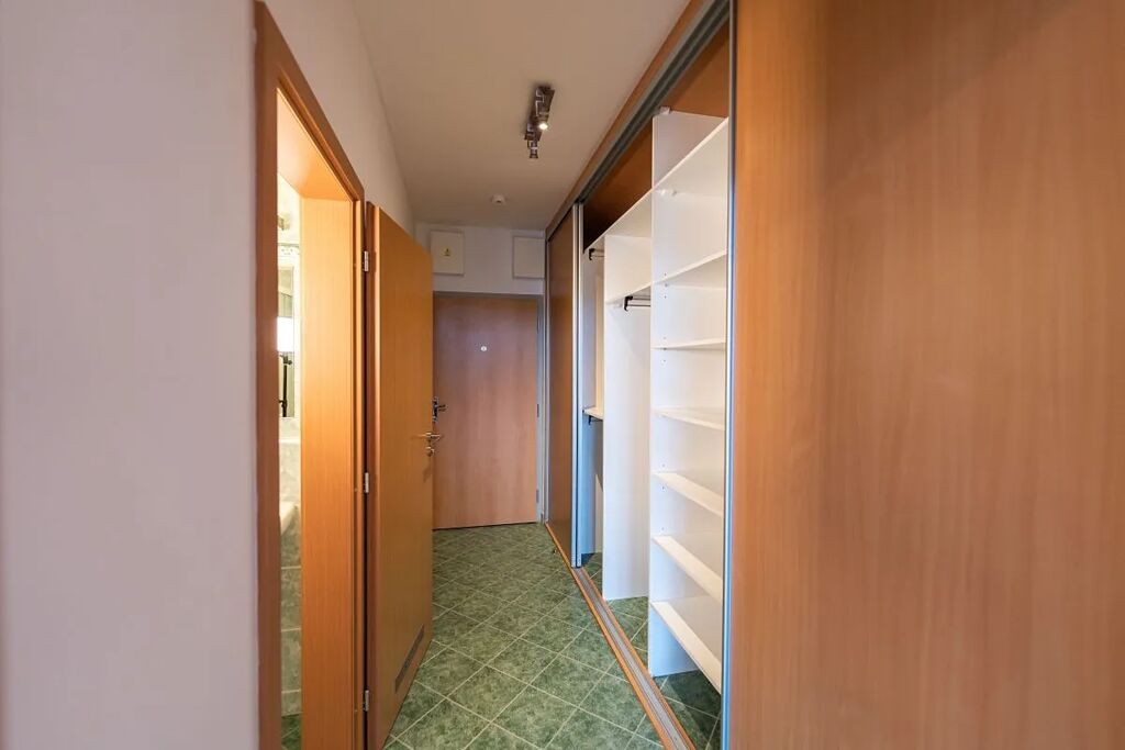 Byt je zařízený kuchyňskou linkou se sklokeramickou varnou deskou, horkovzdušnou troubou a lednicí, koupelna se sprchovým koutem a WC, v předsíni vestavěná šatní skříň.
