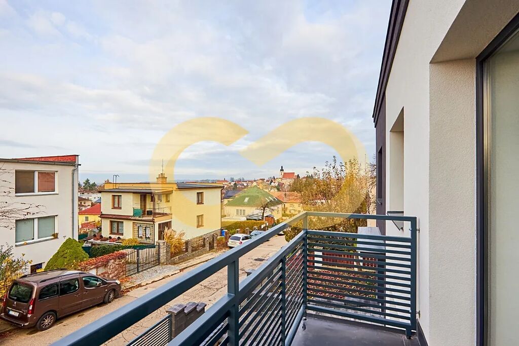 Po schodech vystoupáte do patra, kde na vás čeká prostorná chodba s lodžií a čtyři pokoje. Největší z nich má vlastní balkon s nádherným výhledem na celé České Budějovice.