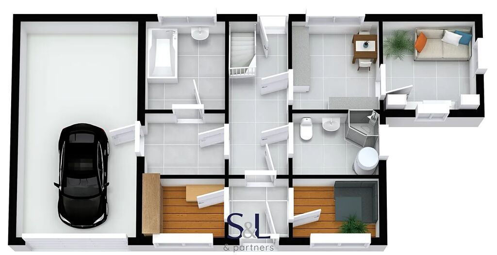 - Přízemí: předsíň, zimní zahrada, dvě koupelny (vana / sprcha + WC), kuchyně a pokoj