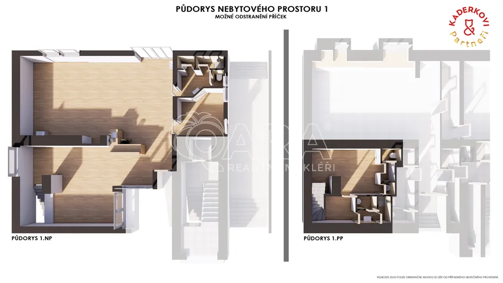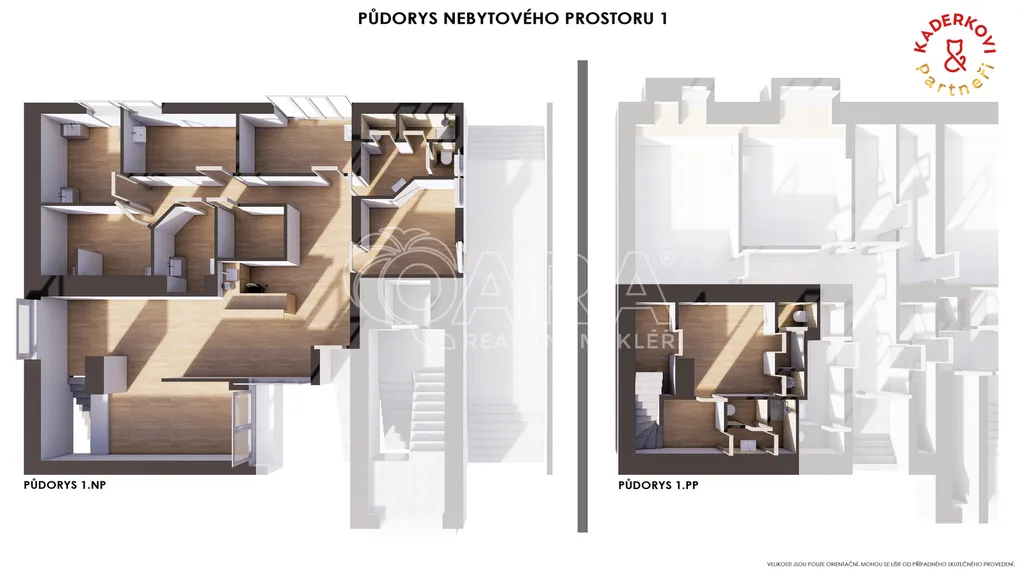 Hlavní části prvního prostoru se nacházejí v 1.NP, směrem do ulice je prosklená výloha, kde si můžete umístit reklamu Vaší značky. Součástí první jednotky jsou i další místnosti umístěné v 1. PP, přístupné schodištěm, které nyní slouží převážně jako zázemí pro zaměstnance. Druhá nebytová jednotka je umístěna v 1.PP.