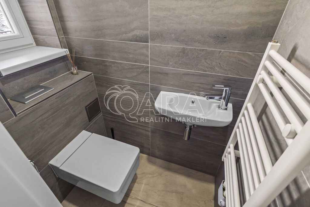 V koupelně je podlahové vytápění, vana, umyvadlo se zrcadlem, skříňka pod umyvadlem, pračka s horním plněním a dřevěná polička na kosmetiku. WC je samostatné.