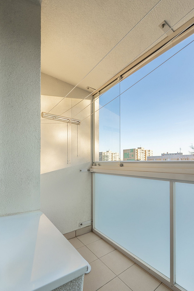 • Prostorný obývací pokoj se vstupem na zasklenou lodžii, ideální pro posezení či relax.