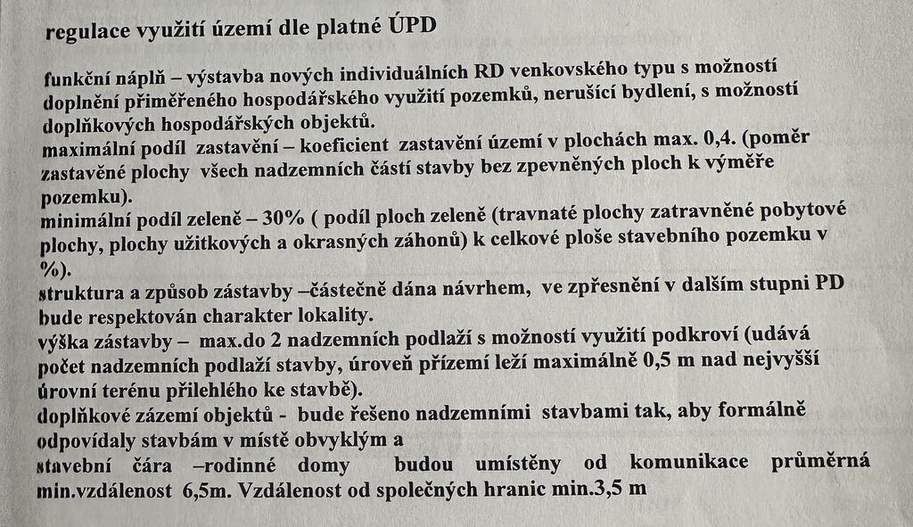 Minimální podíl zeleně: 30% (podíl ploch zeleně, jako jsou travnaté plochy, zatravněné pobytové plochy, plochy užitkových a okrasných záhonů, k celkové ploše stavebního pozemku).
